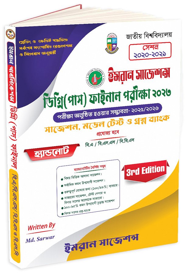 জাতীয় বিশ্ববিদ্যালয়ের ২০২০-২০২১ সেশনের শিক্ষার্থীদের জন্য বিশেষভাবে রচিত ‘ইমরান সাজেশন্স’-এর এই হ্যান্ডনোটটি আপনার ডিগ্রি (পাস) ফাইনাল পরীক্ষা ২০২৩ প্রস্তুতির জন্য একটি পূর্ণাঙ্গ সহায়ক। মোঃ সারওয়ার কর্তৃক রচিত এটি ৩য় সংস্করণ, যা বি.এ, বি.এস.এস, এবং বি.বি.এস শিক্ষার্থীদের জন্য প্রযোজ্য। গ্রেডিং ও ক্রেডিট পদ্ধতির সর্বশেষ সংশোধিত রেগুলেশন ও সিলেবাস অনুযায়ী এই বইটি তৈরি করা হয়েছে।
